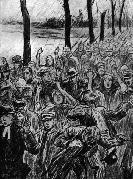 The campaign of publicity launched by the Times was taken up by the British and French press. The public flocked to view, and were stunned as they had never been before by the damning record. The cumulative effect of such pictures as “The Shields of Rosselaere,” showing men, women, and children forced to march in front of the German armies, “Men to the right, women to the left,” in which women and children are being beaten with the butts of rifles; “The Exodus from Antwerp,” “The Mothers of Belgium,” “The Widows of Belgium,” and others which revealed unimaginable depths of human agony, impressed the London crowd as by a solemn ritual. They saw with a vividness hitherto unapproached the hideousness of the war, the unequivocal brutality of the German method, and the naked, insatiable greed in the German purpose. Not now could the timidest soul believe that Germany was fighting a war of defense. Here was the fact inescapable that civilization itself was threatened; here was the whole carnival of lust and conquest as mercilessly depicted on the faces of its agents as they themselves had trampled onward to their shocking goal.