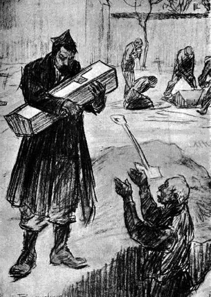 The exhibition was crowded daily for twenty weeks. From nine in the morning till six at night the galleries were packed with people of every grade of society. It is not too much to say that no oration, no literature, no art had brought the real meaning of the war home so convincingly to Londoners as these cartoons. Parents who had already given their sons, wives who had given husbands, were strengthened in their resignation and comforted in their sorrow; those who yet had the sacrifice to make were fortified in their resolve. As I have said, the cumulative effect of these hundred and fifty cartoons on the emotions of a people just awakening to and suffering from the desperate realities of the war was almost overwhelming, and many a man and woman quivered and cried under this pitiless revelation of the stupendous suffering that had been and was yet to be.