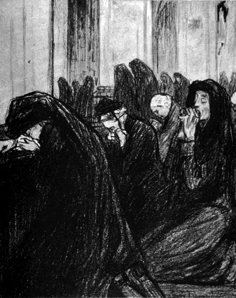 When the stories of the Belgian horror began to circulate in Holland, Raemaekers, like the rest of the humane world, refused to credit them. His own mother was German; he had spent many happy years in Germany; he knew the German peasant as a kindly and happy, if rather stupid fellow; it was incredible that such men could have done the awful things alleged. But the tales persisted, and although the evidence of the wracked and broken refugees who poured into his country by tens of thousands seemed irrefutable, he could not believe it, and readily seized upon the common supposition that the terrible stories were the product of the imagination of an overwrought and panic-stricken people. At length he could remain in doubt no longer, and quietly slipped over the frontier to verify for himself the truth or falsehood of the accusations that had already made Germany guilty of the foulest crimes ever perpetrated in the name of war since the dawn of civilization.