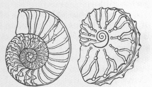 Am´monites, a group of fossil cephalopods, now divided into a large number of genera, ranging from the Coal Measures (Texas) to the uppermost cretaceous strata. The ammonites differ from the nautili in having the tube connecting the chambers placed on the outer margin of the coiled shell, while the calcareous neck where it passes through the partitions is directed forwards. The partitions are much folded, producing markings like the fronds of ferns where they meet the inner wall of the shell. The name arises from confusion with a coiled gastropod, which was held to resemble the horns of the Egyptian deity Jupiter Ammon.
