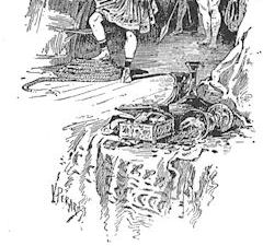 2. The giant, whose name was Skrymer, knew Thor, and proposed that they should travel together, to which the god consented. At night they encamped, and soon the giant was asleep. Thor, finding that he could not untie the provision-bag which the giant had carried all day, went into a rage and struck the sleeper a mighty [Pg 21] blow with, his hammer. Skrymer awoke and said, "The leaves are falling, for one just now fell upon my breast." They lay down again, and soon the giant began to snore so loud that Thor could get no sleep, so he grasped the hammer in both hands and dealt him another blow. Skrymer awoke and called out, "How fares it with thee, Thor? A bird must be overhead—a bunch of moss has just now fallen upon me." Just before daylight Thor thought that he would end this matter then, so he seized his hammer and threw it with all his might. Skrymer awoke, and stroking his cheek said, "An acorn fell upon my head. But let us be stirring, as we have a long day before us."