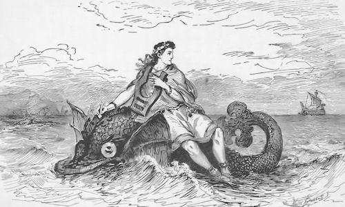 6. But the strains of his music had drawn around him the inhabitants of the deep to listen, and dolphins followed the ship as if charmed by a spell. While he struggled in the waves a dolphin offered him its back, and carried him mounted thereon safe to shore. At the spot where he landed, a monument of brass was afterward erected upon the rocky shore to preserve the memory of the event.