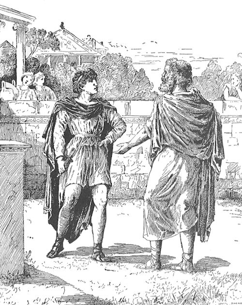 [Pg 11] 8. Arion hastened from the shore, and soon saw before him the towers of Corinth. He journeyed on, harp in hand, singing as he went, full of love and happiness, forgetting his losses, and mindful only of what remained, his friend and his lyre. He entered the hospitable halls, and was soon clasped in the embrace of Periander. "I come back to thee, my friend," he said. "The talent which a god bestowed has been the delight of thousands, but false knaves have stripped me of my well-earned treasure." Then he told all the wonderful events that had befallen him. Periander, who heard him in amazement, said: "Shall such wickedness triumph? Then in vain is power lodged in my hands. That we may discover the criminals you must lie here concealed, so that they come without suspicion."