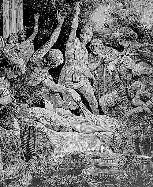 3. At last Ulysses returned in the disguise of a beggar. No one knew him except his old dog Argus, who, in his excess of joy, died while licking his hands. He made himself known to Eumæus, a faithful servant, and by him was presented to Telemachus, who had just returned. Great was the joy of father and son at thus meeting each other. Then the three laid a plan to punish the suitors and to rid Ithaca of their presence. In carrying out this plan, Telemachus went to his mother's palace publicly, and the suitors bade him welcome, though they secretly hated him, and had tried to take his life. Here he found feasting going on, and, at his request, the supposed beggar was admitted to the foot of the table.