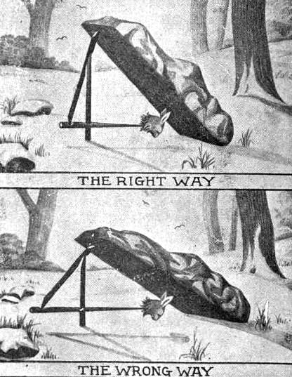 Another thing that should be carefully looked after is triggers. Many cut triggers from green bushes. If this is done, hard wood such as oak, hickory, dogwood, sugar, beech, etc., is best. The upright trigger, which is only a straight piece of wood about a half inch thick, should be slightly rounded so that the spindle will slip off easier when the animal is at bait.