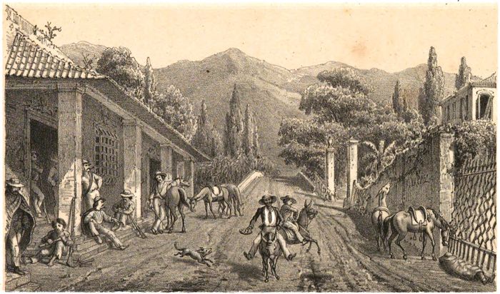 Det Pas, som var os medgivet fra Kommandanten i La Guayra, blev viseret ved Forposterne søndenfor Byen, og efterhaanden som vi nu nærmede os Caracas, saae vi Spor af Krigen og Tegn paa Indbyggernes Dovenskab og urolige Karakteer. Udyrkede Jorder og halvt eller heelt sammenstyrtede Huse glede forbi os. Paa nogle faldefærdige Mure læstes: Eviva Paëz, abayo Tovar! smurt op med plumpe Bogstaver, og denne Inskription, der oftere gjentoges, hyppigt anbragt paa de kurieuseste Steder, godtgjorde da idetmindste, at intet nyt Parti var kommet til Magten, medens vi foretoge Reisen fra La Guayra. Disse Ryttere i fantastiske Uniformer, hvoraf vi saae nogle sprænge os forbi, var altsaa Paëz's Officerer og disse Fodgængere af alle Slags, der nu bleve hyppigere, hans midlertidige Undersaatter. Byen, som anmeldte sig ved en yderst slet Brolægning, var altsaa Caracas. Vi rullede ind i den i Mørkningen efter c. 6 Timers Kjørsel.