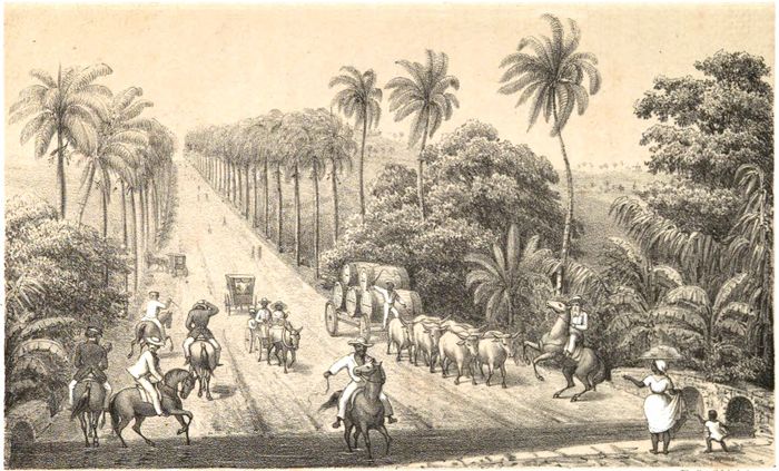 Caracas, Hovedstaden i Republiken Venezuela, ligger kun nogle faa Mile fra La Guayra; men Veien gaaer over de høie Bjerge, der hæve sig langs med Kysten, og ved hvis Fod Byen La Guayra ligger. I de senere Aar er der anlagt en Kjørevei, hvilken vi, da vi vare Flere, besluttede os til at benytte. Fulde af Forhaabning om den Nydelse, vi gik imøde, stege vi ind i den noget skrøbelige careta og rullede ud af Byen. Efter c. 10 Minuters Forløb begyndte allerede Opkjørselen ad Bjergveien, og vi vare snart enige om, at hvad vi følte og saae, overgik vore dristigste Forventninger. Medens vi gradeviis viklede os ud af den tropiske Atmosfære, udfoldede dens glimrende Rigdom og Farvepragt sig under os. Den smalle Slette, der med sine Sukkermarker, Kaffeplantager, Huse og Haver paa den nordlige Side begrændsedes af de mægtige skovbegroede Bjergskrænter, og paa den sydlige af den hvide Skumfryndse, som det caraïbiske Havs Brænding dannede om dens Fod, var et høist tiltalende Syn, som Veien i sine lunefulde Snoninger snart aabnede, snart lukkede for vort Blik. Men netop Veien selv, hen ad hvilken vi fore med den Fart, som tre Heste, opmuntrede af spanske Eder og Pidskeslag, kunde give os, havde vi paa Grund af disse henrivende Udsigter ikke skjænket nogen synderlig Opmærksomhed, før der indtraf et lille Tilfælde, der i et Nu gjorde vore Sandser sobre. Den ene Hest blev indviklet i Seletøiet og faldt; men Kudsken stoppede behændig: som et Lyn var han nede af Bukken, og vi kom naturligviis i en Fart ud af Vognen. Det hændte sig, at et Kjøretøi, hvori der var to spanske Herrer, kom bagefter, og deres Kudsk kom til. Under utallige Eder, blandede med Paakaldelser af Madonna, blev Hesten reist og da Chefens Ordonnants, en Topsgast fra Fore Mers, fik Øie paa et Stykke Toug, begyndte han dermed at knobe det iturevne Seletøi sammen, saa at vi efter nogle Minuters Forløb kunde stige ind og igjen rulle afsted.