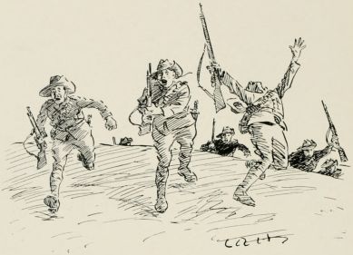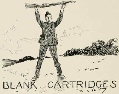 Find we're to act as rearguard to something. Got told off to occupy a bit of a wood right away on the flank. Thank goodness they haven't told me what to do or how long to hold on, or anything, so I shall get out of touch as soon as I can and play off my own bat. Rather good little wood. Men awfully keen on the job. Soon after we occupied position, spotted party of the enemy coming through gap in the hills. Couldn't see them very well on account of the haze, so waited till they got fairly near, and then gave 'em a volley. They sent an orderly over to know what the deuce I meant by firing on the ambulance. Felt rather an ass, but found out afterwards every party they had passed had paid them the same compliment. Soon after scout came in with news of enemy. I wanted to ambush 'em, but some silly fool fired without orders, so it became a regular attack. Put three companies out of action before we retired, but cut it rather too fine, and a few of my chaps got collared. Found the rest of the rearguard had cleared before. Some of 'em mistook us for the bally foe, and blazed into us like old boots. Rotted 'em no end when we got up to them. Everything got in the most awful muddle after a bit; no one knew who was which. After the "Cease fire" sounded came across a lot of chaps firing like mad at anybody who came near. Told 'em the "Cease fire" had gone. "'Cease fire' be damned!" said one of them. "We ain't had a look in till now!"