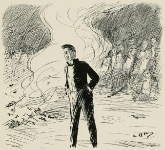 Wednesday.—Something about living in the open that has a very stimulating effect upon one. Made quite an excellent breakfast. The Adjutant gave a most interesting lecture on outpost work before we started; he mentioned several points that I don't mind confessing had slipped my memory. I feel sure, with a little careful instruction, the efficiency of the Volunteer Force would be enormously increased. Must refer to it in the House on earliest opportunity. Did an attack with the Brigade this afternoon; very disappointing. Up to certain stage everything went well, but, as attack developed, got in some way mixed up with the Blankshires, who were, undoubtedly, far out of their proper line. Had slight argument with their C.O. Dear old chap, of course, but absolutely pig-headed. Would not see my point. G.O.C.'s remarks rather uncalled for, under the circumstances. Had to speak to several of the company officers about letting their men get out of hand. The various Adjutants seem to regard the matter with an amount of levity which I don't altogether approve of. Mess very uproarious to-night; most unnecessarily so in my opinion. Heard afterwards one of the subalterns had given a lecture on "Tactics, as he understood them."