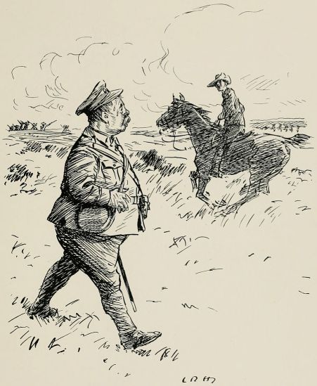 "'Well,' ses the General, 'takin' into consideration that, if the Volunteers is ever wanted, they'll be wanted in a hurry, I should suggest that they might be advantageously employed in fitting themselves for the task.' 'Excellent,' ses the Gov'mint; 'why ever wasn't it thought of before? Go on,' ses he. 'They should be trained,' ses the General, 'to the use of the most modern weapons, an' practised in the lessons which we 'ave learned by bitter experience, to the end that, in the event of an invasion, threatened or actual, every unit shall be able to take the field without delay, sufficiently organised an' equipped to carry it through a short campaign.' 'Marvellous!' ses the Gov'mint. 'It's my dream realised. I will be interviewed on the matter to-morrow.' 'Of course,' ses the General, 'this will undoubtedly entail a certain amount of hextra expense.' 'Not another word!' ses the Gov'mint. 'All bets is off! Train 'em, give 'em transport, stand 'em on their 'eads, or teach 'em to sing; anything you like as long as it don't cost anything. Take a fresh start,' ses 'e.