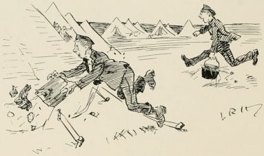 Monday.—Jack Houghton, as was Tent Orderly to-day, goes an' trips over one of the tent ropes when he were bringing the coffee, an' spilt most of it. Tried to get some more, but couldn't, so docked 'im of 'is share; even then we was precious short. Section drill all the morning. Never saw the off'cers so savage—nothing would please them; they're fairly easy all the year, but they makes up for it in camp. Not but what some of the chaps want it—lots of 'em goes on enough to break a feller's 'eart, an' then we all gets the blame.