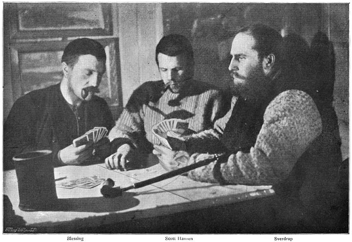 “The festivity continued with music and merriment throughout the evening, and our good humor was certainly not spoiled when our excellent doctor came forward with cigars—a commodity which is getting highly valued up here, as, unfortunately it is becoming very scarce. The only cloud in our existence is that Sverdrup has not yet quite recovered from his catarrh. He must keep strict diet, and this does not at all suit him, poor fellow! He is only allowed wheaten bread, milk, raw bear’s flesh, and oatmeal porridge; whereas if he had his own way he would eat everything, including cake, preserves, and fruit. But he has returned to duty now, and has already been out for a turn on the ice.