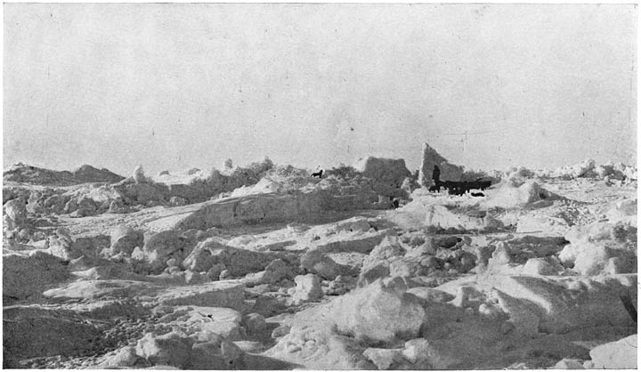 “Monday, November 19th. Confounded affectation all this Weltschmerz; you have no right to be anything but a happy man. And if you feel out of spirits, it ought to cheer you up simply to go on deck and look at these seven puppies that come frisking and springing about you, and are ready to tear you to pieces in sheer enjoyment of life. Life is sunshine to them, though the sun has long since gone, and they live on deck beneath a tent, so that they cannot even see the stars. There is ‘Kvik,’ the mother of the family, among them, looking so plump and contented as she wags her tail. Have you not as much reason to be happy as they? Yet they too have their misfortunes. The afternoon of the day before yesterday, as I was sitting at work, I heard the mill going round and round, and Peter taking food to the puppies, which, as usual, had a bit of a fight over the meat-pan; and it struck me that the axle of the mill whirling unguarded on the deck was an extremely dangerous affair for them. Ten minutes later I heard a dog howling, a more long-drawn, uncomfortable kind of howl than was usual when they were fighting, and at the same moment the mill slowed down. I rushed out. There I saw a puppy right in the axle, whirling round with it and howling piteously, so that it cut one to the soul. Bentzen was hanging on to the brake-rope, hauling at it with all his [6]might and main; but still the mill went round. My first idea was to seize an axe that was lying there to put the dog out of its misery, its cries were so heartrending; but on second thoughts I hurried on to help Bentzen, and we got the mill stopped. At the same moment Mogstad also came up, and while we held the mill he managed to set the puppy free. Apparently there was still some life in it, and he set to work to rub it gently and coax it. The hair of its coat had somehow or other got frozen on to the smooth steel axle, and the poor beast had been swung round and bumped on the deck at every revolution of the wheel. At last it actually raised its head, and looked round in a dazed way. It had made a good many revolutions, so that it is no wonder if it found some difficulty in getting its bearings at first. Then it raised itself on its fore-paws, and I took it aft to the half-deck and stroked and patted it. Soon it got on all four legs again, and began shambling about, without knowing where it was going.