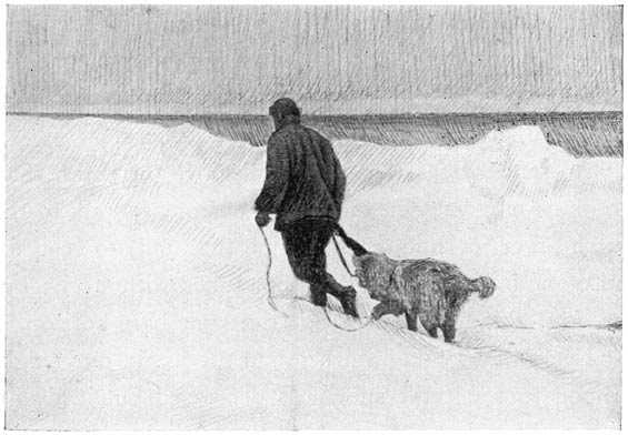 “Friday, December 28th. I went out in the morning to have a look at the crack on the port side which has now widened out so as to form an open lane. Of [38]course, all the dogs followed me, and I had not got far when I saw a dark form disappear. This was ‘Pan,’ who rolled down the high steep edge of the ice and fell into the water. In vain he struggled to get out again; all around him there was nothing but snow slush, which afforded no foothold. I could scarcely hear a sound of him, only just a faint whining noise now and then. I leaned down over the edge in order to get near him, but it was too high, and I very nearly went after him head-first; all that I could get hold of was loose fragments of ice and lumps of snow. I called for a seal-hook, but before it was brought to me ‘Pan’ had scrambled out himself, and was leaping to and fro on the floe with all his might to keep himself warm, followed by the other dogs, who loudly barked and gambolled about with him, as though they wished to demonstrate their joy at his rescue. When he fell in they all rushed forward, looking at me and whining; they evidently felt sorry for him and wished me to help him. They said nothing, but just ran up and down along the edge until he got out. At another moment, perhaps, they may all unite in tearing him to pieces; such is canine and human nature. ‘Pan’ was allowed to dry himself in the saloon all the afternoon.