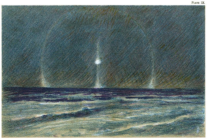 “It was late at night when I retired to my cabin, but I was not yet in a fit mood to go to sleep. I felt I must go out and saunter in the wonderful moonlight. Around the moon there was, as usual, a large ring, and above it [28]there was an arc, which just touched it at the upper edge, but the two ends of which curved downward instead of upward. It looked as if it were part of a circle whose centre was situated far below the moon. At the lower edge of the ring there was a large mock moon, or, rather, a large luminous patch, which was most pronounced at the upper part, where it touched the ring, and had a yellow upper edge, from which it spread downward in the form of a triangle. It looked as if it might be an arc of a circle on the lower side of, and in contact with, the ring. Right across the moon there were drifting several luminous cirrus streaks. The whole produced a fantastic effect.