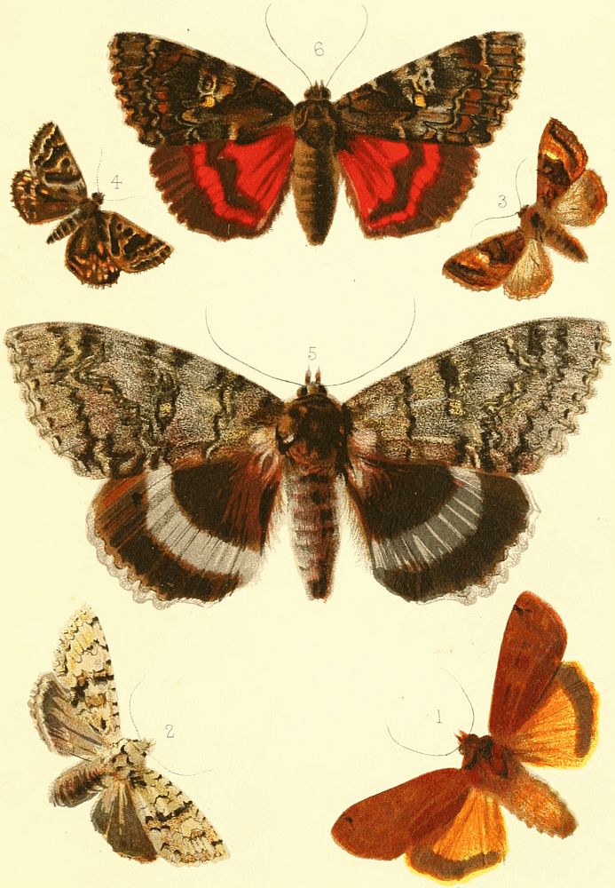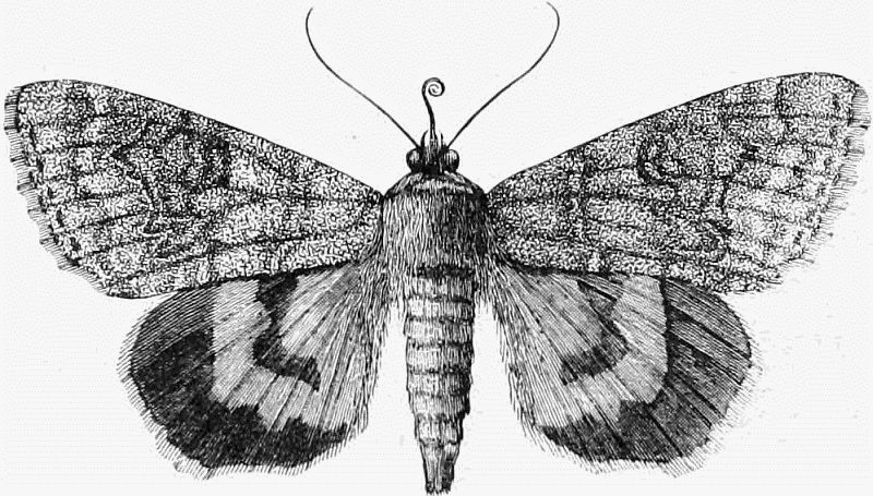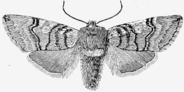 Hybernating moths may also be met with, on the wing if the weather is mild, or sleeping in their sheltered nooks during the frosts. These include several Noctuæ—Auricoma, Lithargyria, Suffusa, Vaccinii, Spadicea, Erythrocephala, Satellitia, Rubiginea, Croceago, Vetusta, Exoleta, Ornithopus, Furcifera, Semibrunnea, Socia, and Libatrix; and also a few Geometræ—Zonaria, Fluviata, Dubitata, Siterata, and Miata.