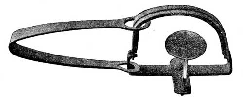 This trap was at one time thought to be good and was tried by many trappers. It was found, however, to be very faulty in many respects. The bearing of the pan lay flat in the mud and would freeze. The setting device lacked any kind of adjustability and might either go off so hard that nothing could spring it or so easily that it would not stay set at all. The jaws which were made of thin sheet steel were not durable.