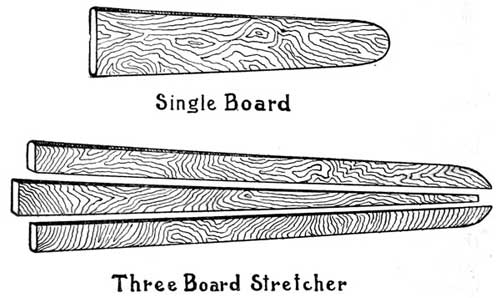I have never had much luck with two-piece stretchers, but use thin board stretchers in one piece with a "sword stick" on each side to fully stretch and admit the air to both sides of the skin. This cures the skin faster and better than when only one side is exposed to the air, says a Maryland trapper.