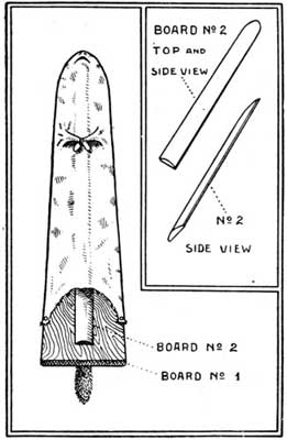 As soon as I get in from my traps (I use a team and wagon), I feed team, dogs and self, then I proceed to skin the game in the usual manner; when game is all skinned I put on my fleshing suit, made of rubber cloth like that buggy curtains are made of, get out my fleshing boards, of which I have three sizes — large, medium and small — for each kind of cased skins except rat, which I flesh with thumb and knife. The fleshing boards are like Fig. 1 on enclosed diagram, made of 1 inch pine free from knots and dressed on both sides, 3 feet 6 inches long, and for skunk 3/4 in. and 10 in. wide, tapered up to a blunt point, edges rounded and sandpapered smooth. These boards can be made of other sizes so as to fit larger or smaller pelts of other kind.