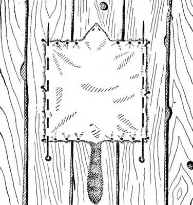 When you think the skin is done, take it and put it on a stretcher like a coon stretcher, but of course altered to fit the skin you are tanning; stretch the skin tight but not too tight and put in the sun; at intervals of half an hour apply with a brush or rag mixtures number three until the skin will soak up no more.
