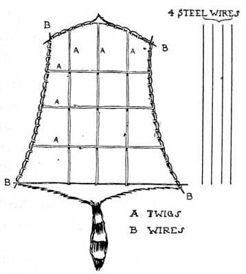 Two large sizes with similar proportions are required for the large animals, the largest size suitable for the full grown otter and wolf, should be five feet and a half long, seven inches wide at the large end when fully spread by the wedge, and six inches at the small end. An intermediate size is required for the fisher, raccoon, fox and some other animals, the proportions of which can be easily figured out.