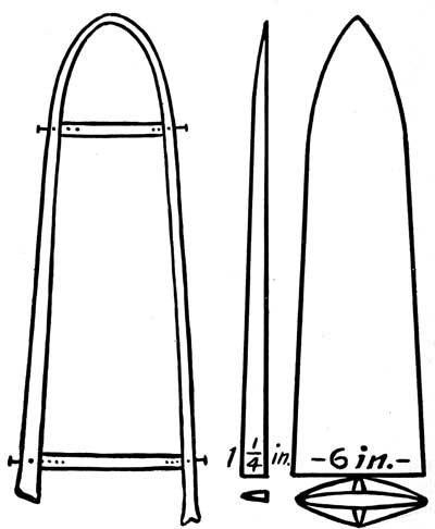 When off from home, I use stretchers made from saplings, as boards suitable are not to be had everywhere, and cannot be bothered with when going light. To make these, cut osier, willow or hickory switches, straight and thick as the finger, about four feet long; cut two short pieces for rats 4 and 6 inches long and carefully bending the long piece. Nail these in with a small wire nail at each end. A handful of shingle or lath nails and a clump of osier sprouts will make a full outfit of stretchers for a temporary camp.