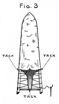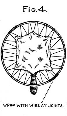 I like this stretcher, as it airs both sides of pelt and will dry them in half the time. Fig 3 shows manner of fastening pelt; on belly side it can be drawn down and fastened to tail pieces with sack needle and twine; it is made of two or more poles fastened in the shape of a hoop.