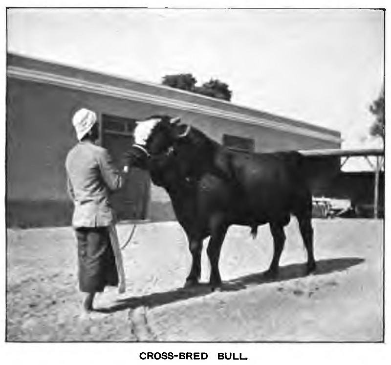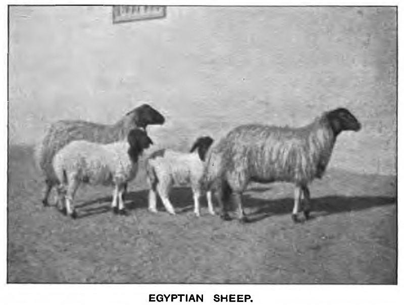 One thing that strikes the European in Egypt, when passing beyond the more carefully cultivated portions near the city, is the absence of trees other than the indigenous palms; but here, in these newly-reclaimed portions, much has been done, as already mentioned, in the way of planting. For instance, the approaches to a range of buildings in connection with this farm were studded with acacias, ornamenting what proved to be the pigeon houses which are such a regular adjunct to an Egyptian cultivator’s home. Their occupants bear a strong resemblance to our own blue rocks, or wood pigeons. Another building was the dairy farmhouse, well-built, simple, and most suitable; while in the neighbouring fields the cows were pasturing after the economical plan carried out in our Channel Islands—where each milk-producer is not allowed to wander through and waste the precious herbage at her own sweet will, but is tethered to a stake—while the calves had an enclosure to themselves. Here were many examples of experiments being tried to improve the breed, the favourite animal being a cross between the Swiss—Fribourg—and native; and in this cross-breeding only those proved to be advantageous are retained. Such as do not show some marked advance upon the native stock, either for breeding or the production of milk, are sold.