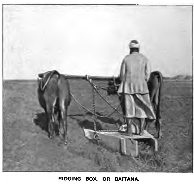 The preparation commences in January, and generally three ploughings are required to bring the land into a proper tilth. The more thorough the cultivation the better for the crop. The land is then thrown into ridges measuring from crest to crest three feet. Then a pair of ridges is drawn across the longitudinal ridges, the distance between each pair of ridges (which form a waterway) being twenty-two yards. Between these pairs—i.e. eleven yards distance from each—a single ridge is made. This acts as a partition to stop the water. Six ridges are irrigated by allowing the water to flow from these cross-waterways, and the reason for confining the length of the ridges to eleven yards is to ensure the evenness of the irrigation as to height of water level, as the ground may have slight fall, and if the whole length of the ridges were to be watered at once the water would rise too high at the lower parts before the higher levels were properly soaked.
