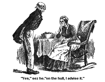 Them words I reported to Josiah, and sez I in anxious axents, “Dr. Gale advises us to go.”