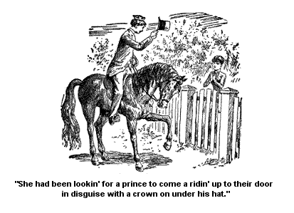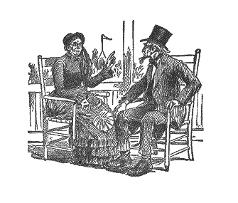 She and Abram sot a few seats in front of us, and I thought I see a certain look to the backside of her head that meant poetry. It wuz a kind of a sot look, and riz up like. But I can’t say for certain for she didn’t have no chance to tell me about it. Abram looked down at her all the time as if he jest worshipped her. And she is a good little creeter, and will make him a happy wife; I don’t make no doubt. As I said, the old lady is goin’ to live with Susan. They went right on in the train, for Ardelia’s home lays beyond Jonesville, and Abram wuz goin’ home with her by Deacon Tutt’s request. They are willin’.