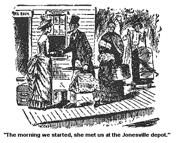 Wall, we sot sail for home in good spirits, and the noon train. And we reached Jonesville with no particular eppisodin’ till we got to the Jonesville Depot.
