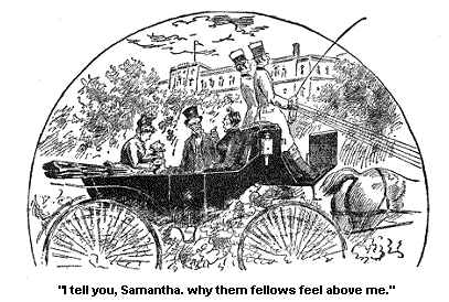That night after we got home from the Roller Coaster, I felt dretful sort a down hearted about Abram Gee, I see in that little incident of the day, that Bial, although I couldn’t like him, yet I see he had his good qualities, I see how truthful he wuz. And although I love truth—I fairly worship it—yet I felt that if things wuz as he said they wuz, he would more’n probable get Ardelia Tutt, for I know the power of Ambition in her, and I felt that she would risk the chances of happiness, for the name of bein’ a Banker’s Bride.