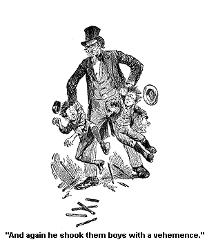 “Wall, the nurse had her out with the baby and the little boys. And we s’pose she had been drinkin’ too much. We all knew she drinked, and she wuzn’t in a condition to go out with the children this mornin’, and Miss Flamm would have noticed it and kep’ ’em in, but the dog wuz sick all night, and Miss Flamm wuz up with it most all night, and she felt wore out this mornin’ with her anxtety for the dog, and her want of sleep, and so they went out, and it wuzn’ more’n half an hour before it took place. She left the baby carriage and the little boys and girl in a careless place, not knowin’ what she wuz about, and they got run over. The baby and the little boys wuzn’t hurt much, but they think the little girl will die. Miss Flamm went right into a caniption fit,” sez she, “when she wuz brung in.”