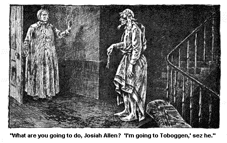 But still that idee kep’ a hantin me; “You’d better go to Saratoga next summer, you and Josiah.” And it whispered, “Mebby it will help Josiah’s corns.” (He is dretful troubled with corns.) And so the idee kep’ a naggin’ me, it nagged me for three days and three nights before I mentioned it to my Josiah. And when I did, he scorfed at the idee. He said, “The idee of water curing them dumb corns—“