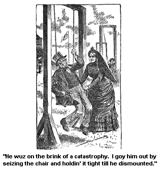 The way on’t wuz: It bein’ early when Ardelia got here, Bial proposed to take her out for a drive and she consented. He got a livery horse, and buggy, and they say that the livery man knew jest what sort of a creeter the horse wuz, and knew it wuz liable to break the buggy all to pieces and them to, and he let ’em have it for goin.’ But howsumever, whether that is so or not, when they got about five or six milds from Saratoga the horse skeert out of the road, and throwed ’em both out.