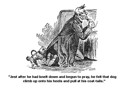 What to do he didn’t know. He couldn’t stop his prayer on such a time as this and kill a dog, though he owned up to me that he felt like it, and he couldn’t keep still and feel his coat-tails tore off of him, and be growled at, and shook, and pawed at all day. So he said after the dog had gin a most powerful tug, almost a partin’ the skirts asunder from his coat, he drew up one foot carefully (still a keepin’ his face straight and the prayer agoin’) and brung it back sudden and voyalent, and he heard the dog strike aginst the opposite side of the room with one short, sharp yelp, and then silence rained down and he finished the prayer.