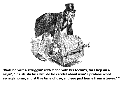Wall, he wuz a strugglin’ with it and with his feelin’s, for I kep’ on a sayin’, “Josiah, do be calm! Do be careful about usin’ a profane word so nigh home and at this time of day, and you jest home from a tower.”