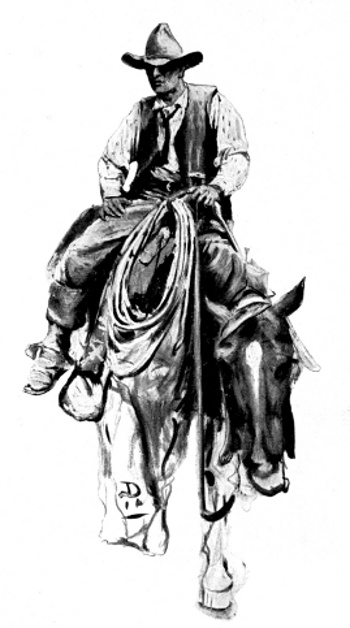 Now, a "town cowboy" is a term of reproach among us, signifying a young man who never did range work, but wears the clothes and does trick roping for the delectation of visitors. Ultimately he joins a Wild West show and instructs the rising generation.