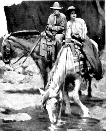 It was five days later that Mrs. Horne, emerging from the door on hearing a horse neigh, espied a pair of riders coming up the lane. Her mouth opened in amazement and she sped into the house, crying excitedly for Manuel. Lafe, Jr., pulled up at the yard gate and said; "No, you don't, Moffatt. You get down first and go in front."