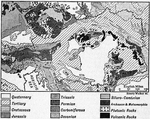 Geology.—The Austro-Hungarian Monarchy is traversed by the great belt of folded beds which constitutes the Alps and the Carpathians; a secondary branch proceeding from the main belt runs along the Adriatic coast and forms the Julian and Dinaric Alps. In the space which is thus enclosed, lies the Tertiary basin of the Hungarian plain; and outside the belt, on the northern side, is a region which, geologically, is composite, but has uniformly resisted the Carpathian folding. In the neighbourhood of Vienna a gap in the folded belt—the gap between the Alps and the Carpathians—has formed a connexion between these two regions since the early part of the Miocene period. On its outer or convex side the folded belt is clearly defined by a depression which is generally filled by modern deposits. Beyond this, in Russia and Galicia, lies an extensive plateau, much of which is covered by flat-lying Miocene and Pliocene beds; but in the deep valleys of the Dniester and its tributaries the ancient rocks which form the foundation of the plateau are laid bare. Archaean granite is thus exposed at Yampol and other places in Russia, and this is followed towards the west by Silurian and Devonian beds in regular succession—the Devonian being of the Old Red Sandstone type characteristic of the British Isles and of Northern Russia. Throughout, the dip is very low and the beds are unaffected by the Carpathian folds, the strike being nearly from north to south. After Devonian times the region seems to have been dry land until the commencement of the Upper Cretaceous period, when it was overspread by the Cenomanian sea, and the deposits of that sea lie flat upon the older sediments.