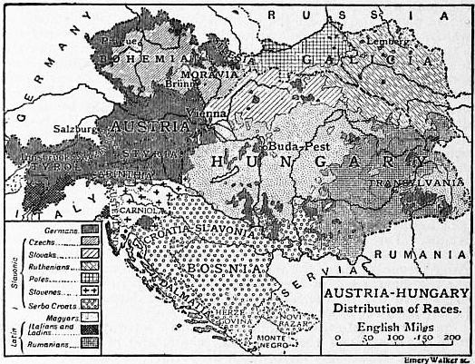 Races.—From an ethnographical point of view Austria contains a diversity of races; in fact no other European state contains within its borders so many nationalities as the Austrian empire. The three principal races of Europe—the Latin, the Teutonic and the Slavonic—are all represented in Austria. The Slavonic race, numbering 15,690,000, is numerically the principal race in Austria, but as it is divided into a number of peoples, differing from one another in language, religion, 973 culture, customs and historical traditions, it does not possess a national unity. Besides, these various nationalities are geographically separated from one another by other races, and are divided into two groups. The northern group includes the Czechs, the Moravians, the Slovaks, the Ruthenians and the Poles; while the southern group contains the Slovenes, the Servians and the Croats. Just as their historical traditions are different, so are also the aspirations of these various peoples of the Slavonic race different, and the rivalries between them, as for instance between the Poles and the Ruthenians, have prevented them from enjoying the full political advantage due to their number. The Germans, numbering 9,171,614, constitute the most numerous nationality in Austria, and have played and still play the principal role in the political life of the country. The Germans are in a relative majority over the other peoples in the empire, their language is the vehicle of communication between all the other peoples both in official life and in the press; they are in a relatively more advanced state of culture, and they are spread over every part of the empire. Historically they have contributed most to the foundation and to the development of the Austrian monarchy, and think that for all the above-mentioned reasons they are entitled to the principal position amongst the various nationalities of Austria. The Latin race is represented by the Italians, Ladini and Rumanians.