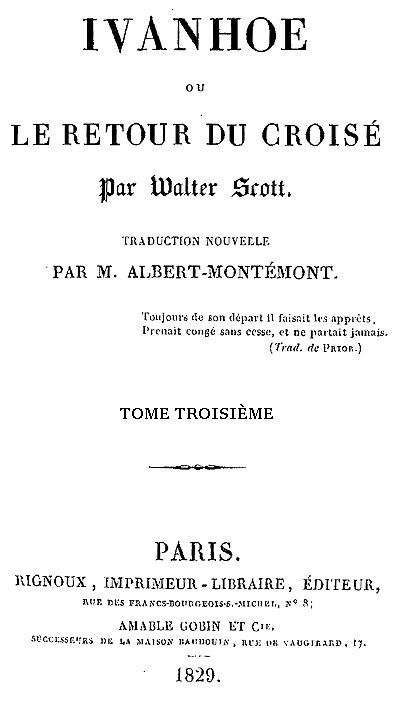 «Je prie votre grâce de me pardonner, dit Fitzurse maudissant intérieurement la sotte vanité de son maître; mais, comme la circonstance pouvait être urgente, et que la perte même de quelques minutes pouvait devenir funeste, j'ai cru devoir prendre sur moi cette grande responsabilité dans une affaire où il s'agit de vos plus grands intérêts.»--«Je te pardonne, Fitzurse, dit gravement le prince; ton intention excuse ta prompte et excessive témérité... Mais qui est-ce qui nous arrive ici? de Bracy lui-même, par la sainte croix! et dans quel étrange équipage il se présente devant nous!»