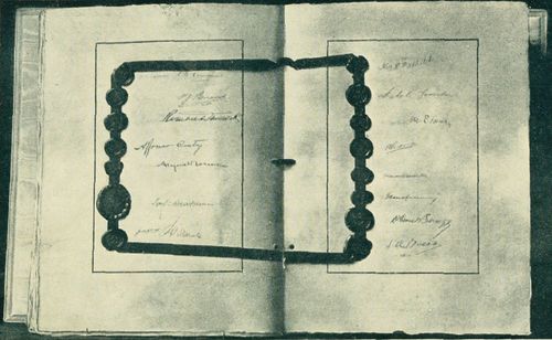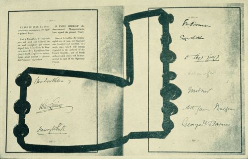 Signing the Peace Treaty in the Hall of Mirrors, Palace of Versailles, on June 28, 1919. Georges Clemenceau, French Premier, is standing and inviting the German delegates to affix their signatures to the document.