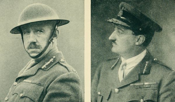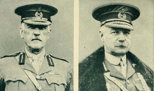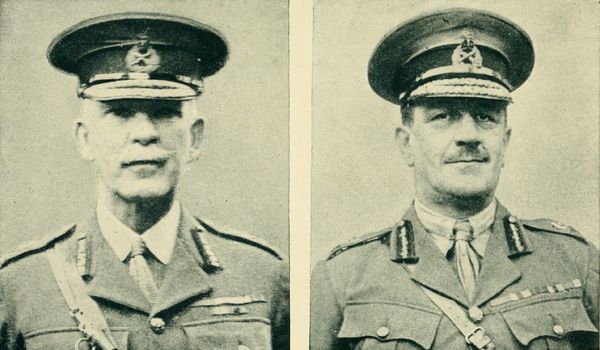 At the left is Major General Hon. Sydney Chilton Mewburn, who became Canadian Minister of Militia and Defense in 1917; at the right is Major General Sir Edward Whipple Bancroft Morrison, G. O. C., Canadian Corps Artillery from 1917 to 1919.
