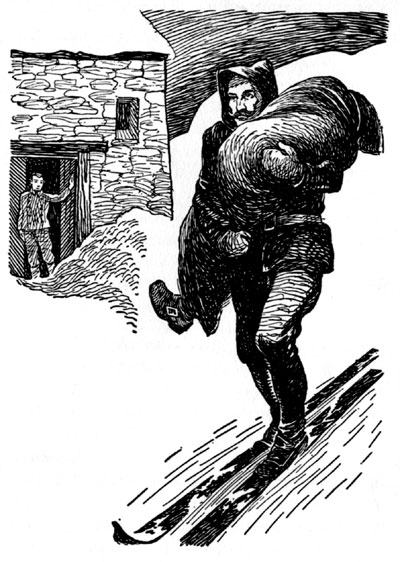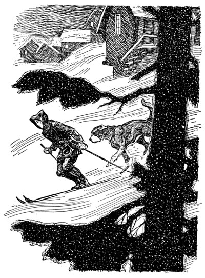 Followed only by Caesar, who found the going easy on a path packed by so many skis, Franz stayed just far enough behind Anton Martek to avoid running up on the toboggan the giant pulled. Father Benjamin[144] led the way, followed by Father Mark. There were ropes and shovels on the toboggan.
