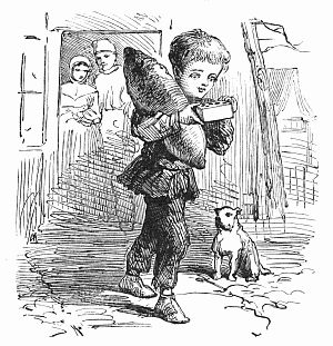 Mercy on us, what a noisy world we quiet people live in! Did[20] Annie ever read the Cries of London City? With what lusty lungs doth yonder man proclaim that his wheelbarrow is full of lobsters! Here comes another mounted on a cart, and blowing a hoarse and dreadful blast from a tin horn, as much as to say "Fresh fish!" And hark! a voice on high, like that of a muezzin from the summit of a mosque, announcing that some chimney-sweeper has emerged from smoke and soot, and darksome caverns, into the upper air. What cares the world for that? But, welladay! we hear a shrill voice of affliction, the scream of a little child, rising louder with every repetition of that smart, sharp, slapping sound, produced by an open hand on tender flesh. Annie sympathizes, though without experience of such direful woe. Lo! the town-crier again, with some new secret for the public ear. Will he tell us of an auction, or of a lost pocket-book, or a show of beautiful wax figures, or of some monstrous beast more horrible than any in the caravan? I guess the latter. See how he uplifts the bell in his right hand, and shakes it slowly at first, then with a hurried motion, till the clapper seems to strike both sides at once, and the sounds are scattered forth in quick succession, far and near.
