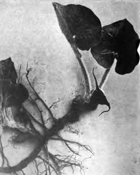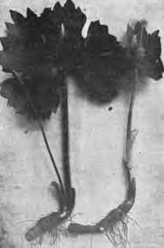 I have seen some very old roots and have been told that roots with fifty scars have been dug. The leaf on a seedling is formed of three small parts on a stem, growing directly out of a perennial root and during the first year it remains that shape. The second year the stem forks at the top and each fork bears two leaves, each being formed of five parts. The third year the stem forks three ways and bears three leaves, each formed of five parts, much like the Virginia creeper.
