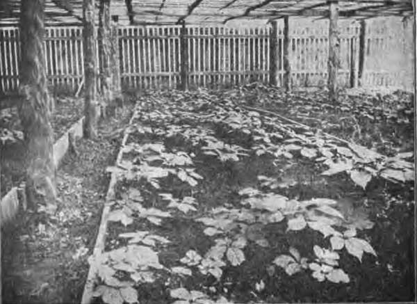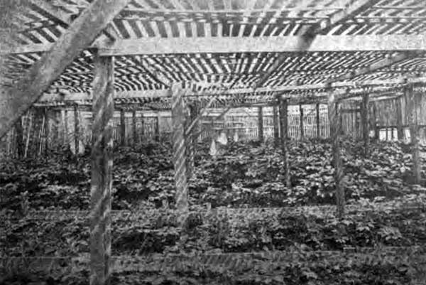 The forest is the home of the Ginseng plant and the closer we follow nature the better results we get. I am growing it now under artificial shade; also in the forest with natural shade, says an Ohio party. A good shade is made by setting posts in the ground, nail cross-pieces on these, then cover with brush. You must keep out the sun and let in the rain and this will do both. Another good shade is made by nailing laths across, allowing them to be one-half inch apart. This will allow the rain to pass thru and will keep the sun out. Always when using lath for shade allow them to run east and west, then the sun can't shine between them.