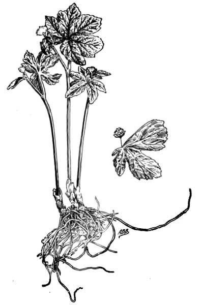 Description of Plant — The reddish stems of this slender, graceful perennial of the rose family (Rosaceae) are about 2 to 3 feet high, several erect and branched stems being produced from the same root. The leaves are almost stemless and trifoliate; that is, composed of three leaflets. They are ovate or lanceolate, 2 to 3 inches long, narrowed at the base, smooth and toothed. The nodding, white pinkish flowers are few, produced in loose terminal clusters from May to July. The five petals are long, narrowed or tapering toward the base, white or pinkish, and inserted in the tubular, somewhat bell shaped, red tinged calyx. The seed pods are slightly hairy.